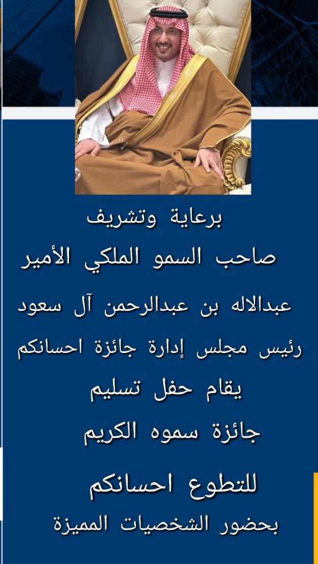 دعوة لحفل تكريميي ضمن ثلاث شخصيات تم اختيارها لجائزة التطوع ضمن فعاليات جمعية إحسانكم التي يرأسها صاحب السمو الملكي الأمير عبد الإله بن عبد الرحمن بن ناصر آل سعود في دورتها الثالثة