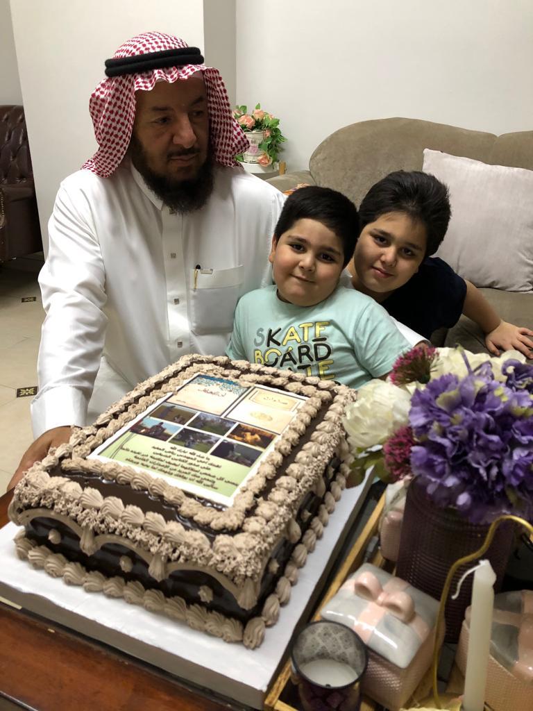 صورة تجمعني مع كل من الإبن محمد والابن كرم وكيكة هدية من الاخ العزيز عماد الرجيب بمناسبة صدور كتابين من كتبي